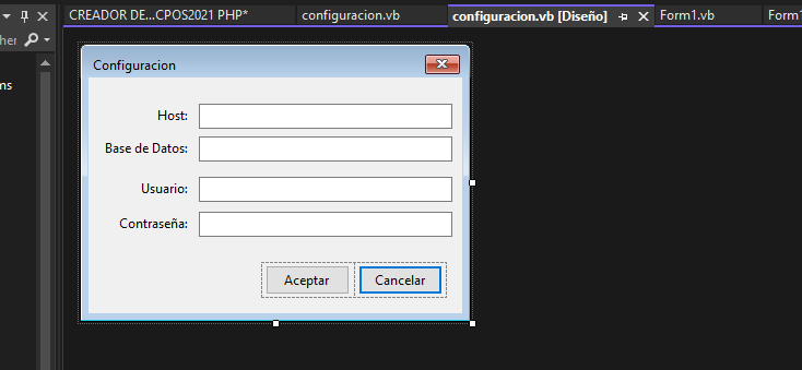 Añadimos las cuatro etiquetas con las cajas de texto, textbox , en los nombres procuraremos mantener un estándar por ejemplo en los campos de textos siempre le pondremos un nombre empezando como txt como txtHost, txtBaseDeDatos, txtUsuario y txtContraseña