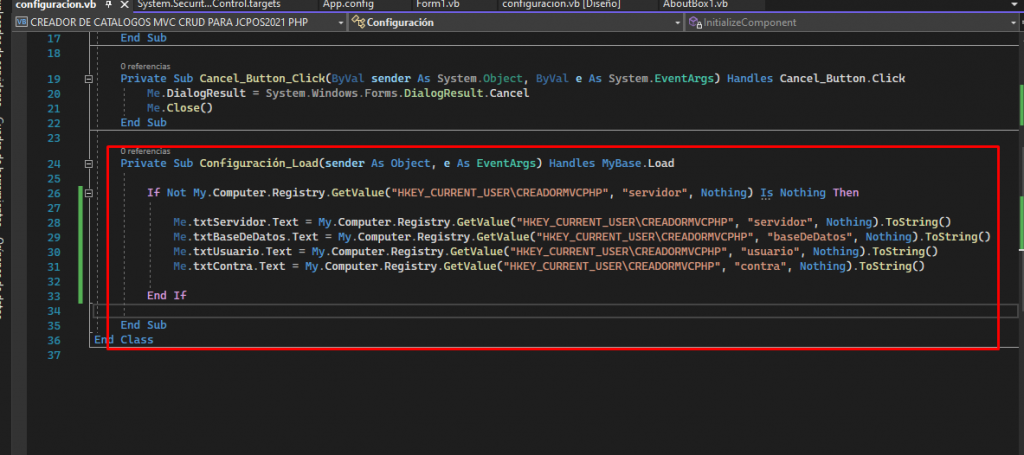 Entonces en el load de la porfa agregamos el siguiente código, lo que hace es leer el registro de Windows donde estaremos guardando los datos de conexión