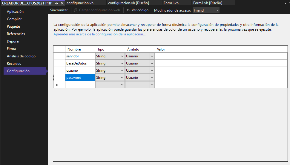 Para ello vamos a crear una ventana llamada configuración y vamos a crear los campos de texto necesarios como que son los siguientes: