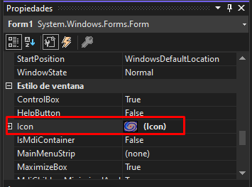 Para cambiar el icono de la aplicación nos vamos a la la propiedad Icon y seleccionamos el archivo de icono