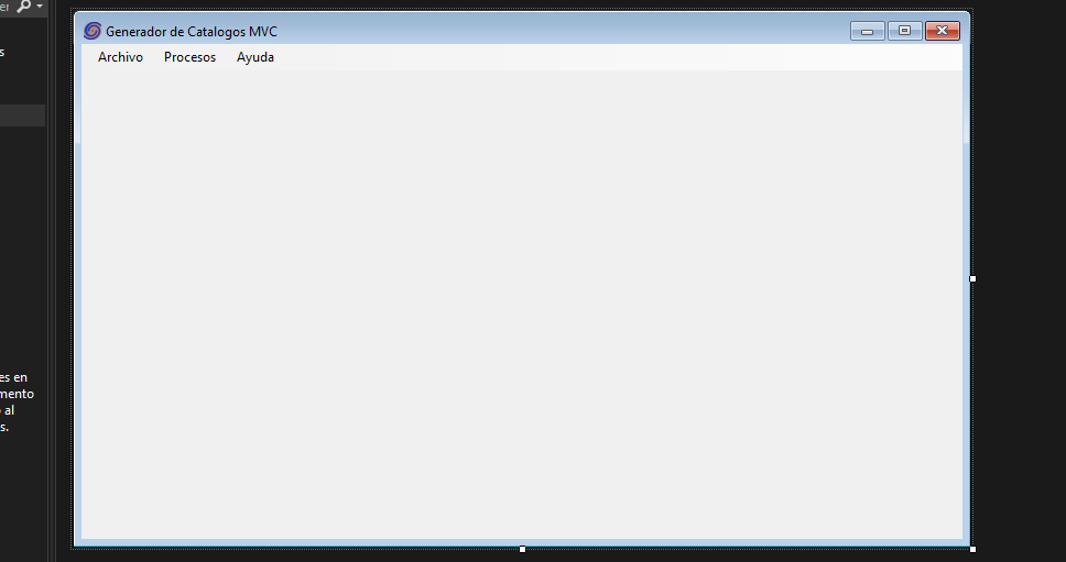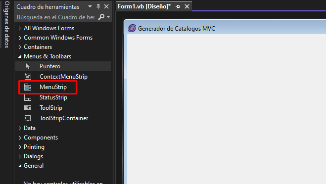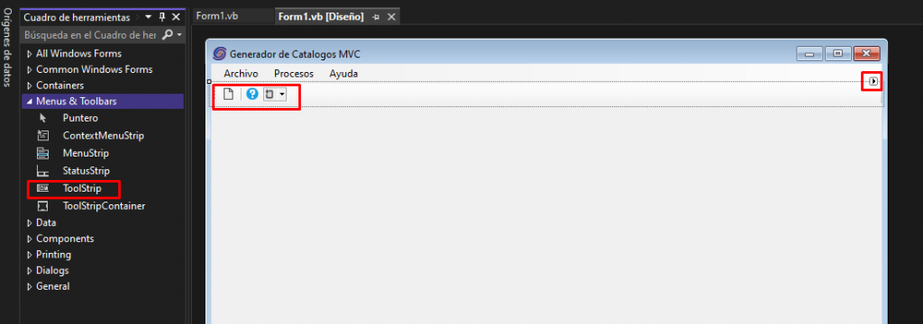 Para agregar el menu nos vamos al cuadro de herramientas y en la categoría Menus & Toolbars y arrastramos el control MenuStripAquí vemos como agregamos los menús Archivo, Procesos y ayuda, dentro de Archivo meteremos los sub menús Configuración y salir, dentro de Procesos metimos el sub menú crear catalogo y en el menú Ayuda metimos el sub menú de manual y acerca de