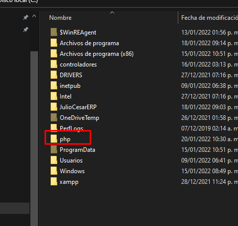 Descomprimimos y en mi caso son las que están en la carpeta x64Ponemos las librerías en la carpeta EXT en donde están los archivos de PHP en mi caso la ruta es la que se ve en la imagenEn el archivo de configuracion que normalmente se llama php.ini agregamos las siguientes lineas extension=php_pdo_sqlsrv_81_nts extension=php_sqlsrv_81_nts.dll