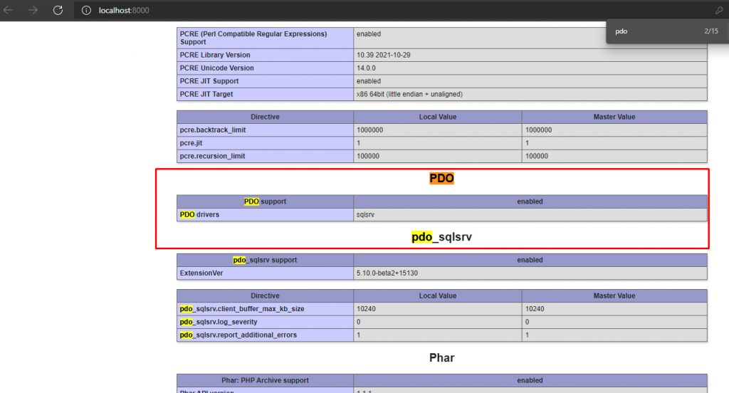 Si corremos el PHPINFO debe salir activo el modulo de pdo_sqlsrv