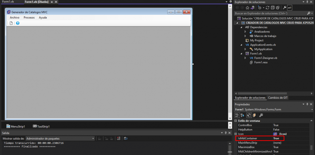 Seleccionamos la ventana en general y en la propiedad isMDIContainer la dejamos como true “Verdadero” y entonces ya vamos a poder agregar ventanas internas dentro del programa