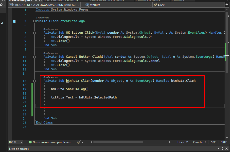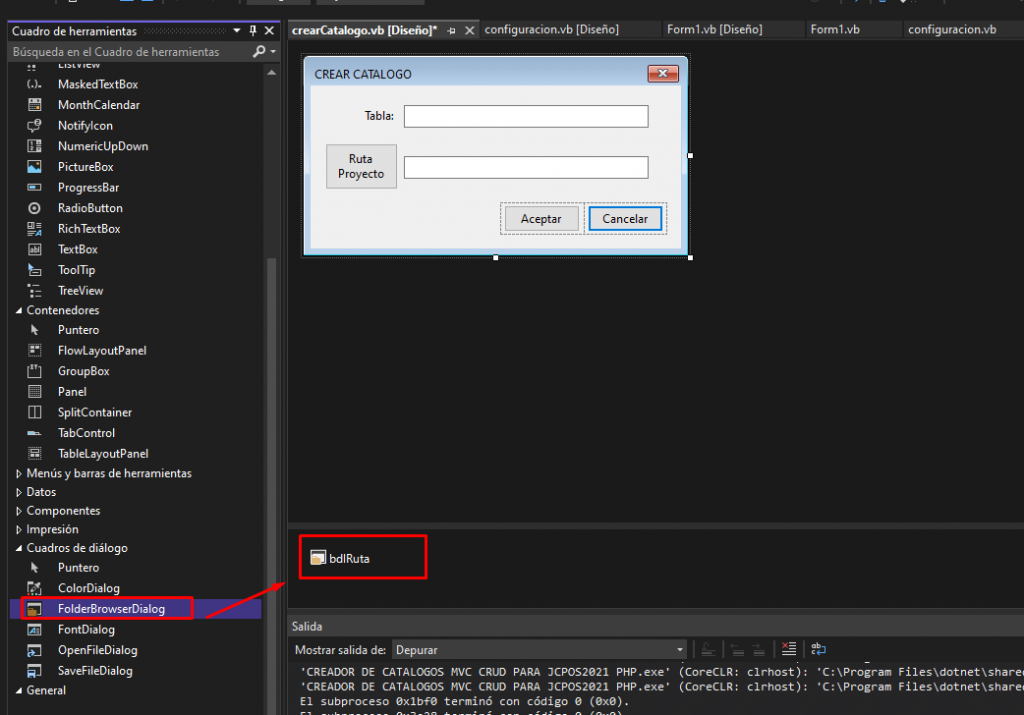 Son 3 controles muy simples, de he hecho el componente que no se ha usado anteriormente en es este proyecto es FolderBrowserDialog, este nos permitira elegir la ruta del proyecto JCPOS2021