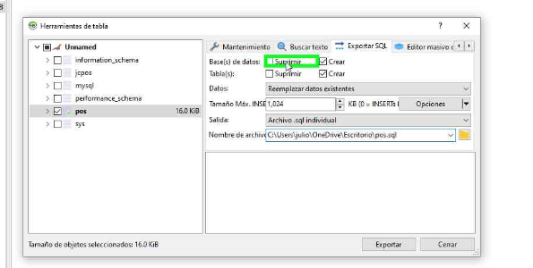 Le ponemos el nombre y ubicación a la base de datos que queremos crear y elegimos si deseamos crear la base de datos y si existe suprimirla para volverla crear, al darle exportar generar el archivo en la ruta elegida