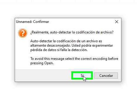 Nos pregunta si queremos que auto-detecte la codificación del archivo le damos click al boton Si