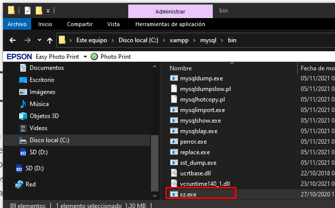 Primero nos posicionamos en la carpeta bin de mysql, en mi caso es la siguiente ruta