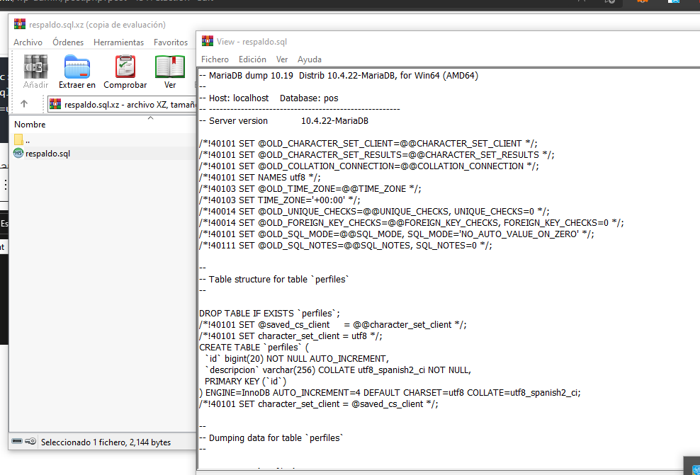 Vemos como guardo el archivo respaldo.sql.xzA abrir el archivo comprimido y ver el archivo SQL nos debe mostrar algo similar a la imagen