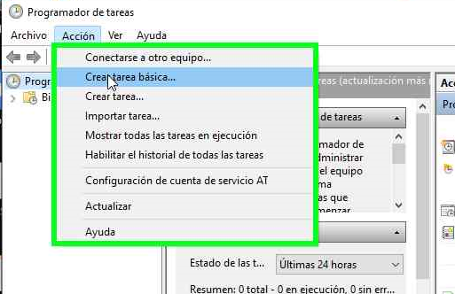Abrimos el programador de tareas ya esta instalado en Windows Solo nos vamos al Inicio y escribimos programador de tareas, luego vamos al menú acción y le damos clic en Crear Tarea básica