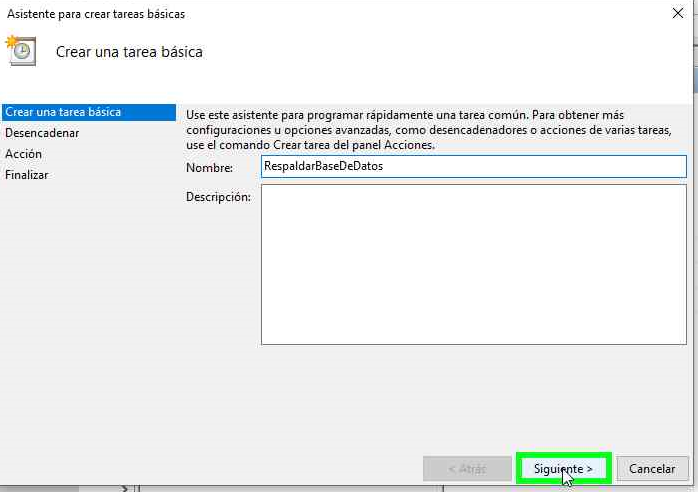 Le ponemos el nombre de la tarea programada y le damos siguiente