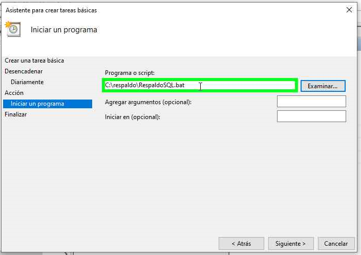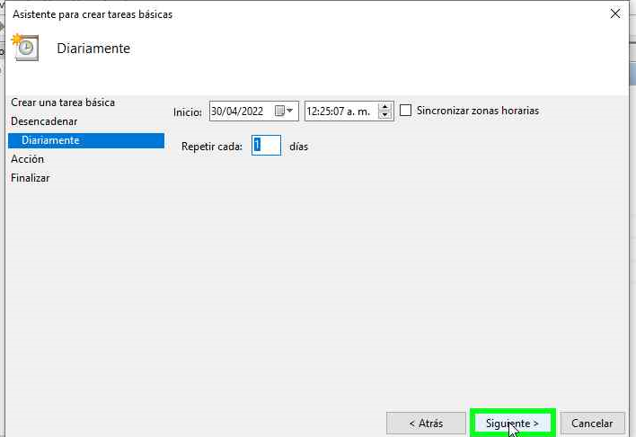 Le ponemos cada tanto tiempo se va ejecutar el archivo .bat,le damos siguiente