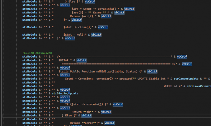 strModelo &= "" & "       $stmt = Conexion:: conectar() -> prepare("" UPDATE $tabla Set " & strCamposUpdate & "" & vbCrLf