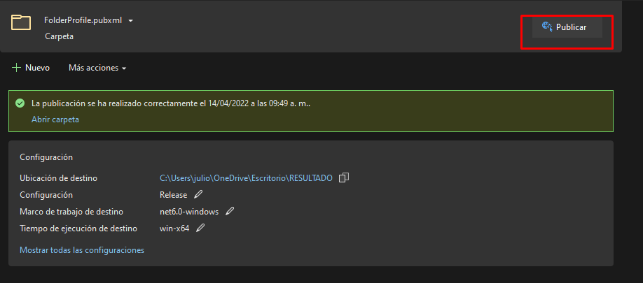 Finalmente de damos click en publicar y nos va a generar el EXE