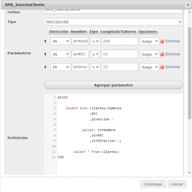 Bien como prueba vamos a hacer un procedimiento almacenado básico, tal procedimiento va a insertar en la tabla clientes y luego ejecutara una consulta.