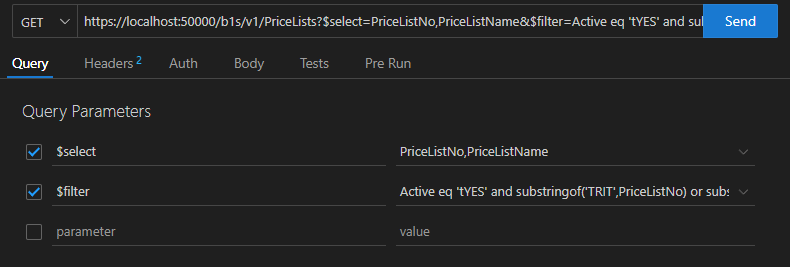 https://localhost:50000/b1s/v1/PriceLists?$select=PriceListNo,PriceListName&$filter=Active eq 'tYES' and substringof('TRIT',PriceListNo) or substringof('TRIT',PriceListName)