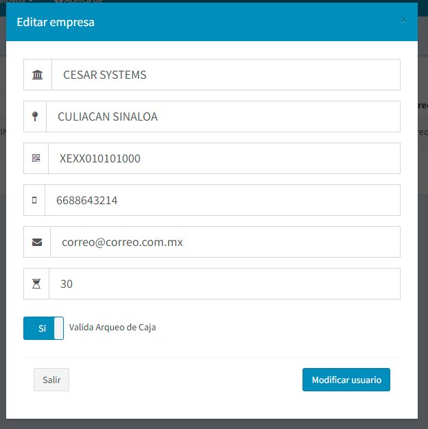 Aquí modificamos los datos de la empresa, solo es para una empresa, solo se debe modificar cuando sea necesario ya que con estos datos se genera la licencia.