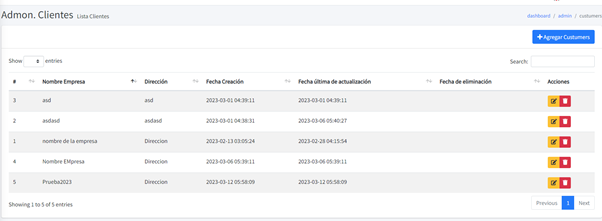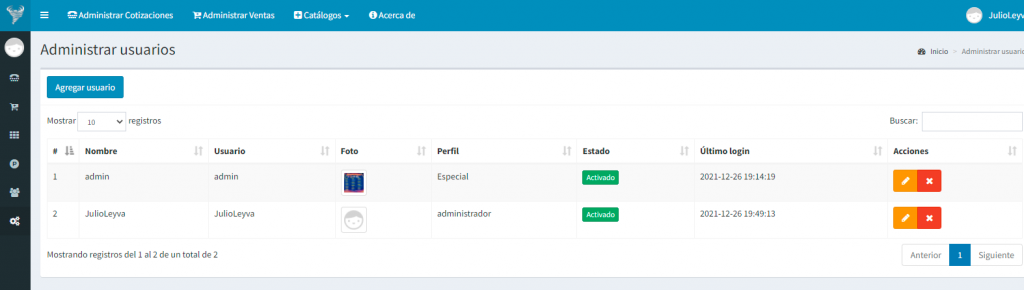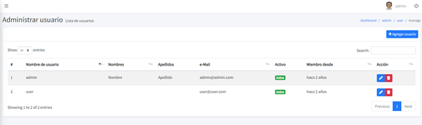 Aquí vemos la lista de todos los usuarios creados, en la columna final están los botones para modificar y eliminar, en el botón de arriba es para crear otro usuario