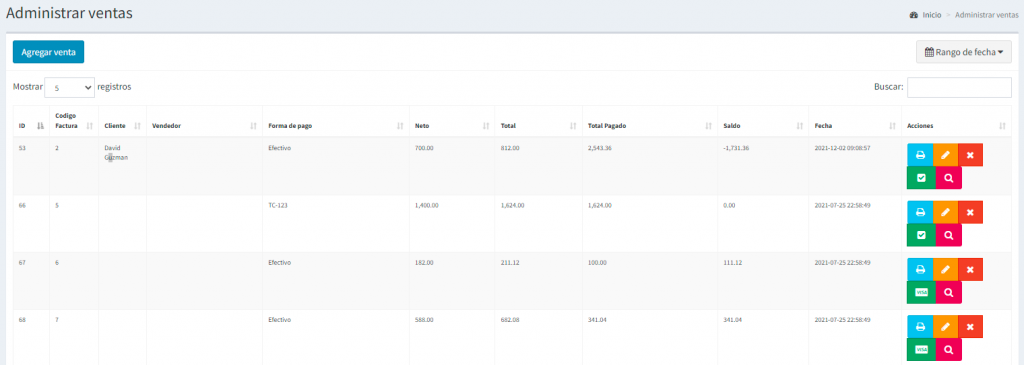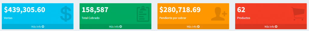 Estas son las cajas superiores y en el primer cuadro azul nos muestra todas las ventas registradas, si le damos click en Mas info nos lleva a ver la lista de todas las ventas
