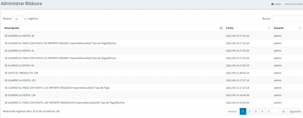 Esta opción nos sirve como información para ver los movimientos de los usuarios en caso de error del sistema o error humano