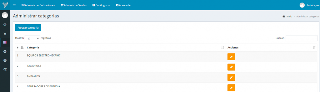 Como vemos es un catalogo con el mismo estándar que el de usuarios, así se va a manejar en todo el sistema, en este tipo de catalogo se pueden dar las altas bajas y cambios.