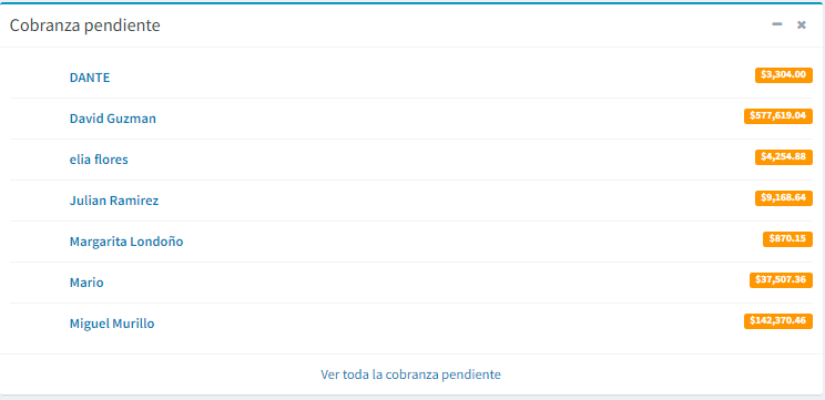 En la caja naranja nos muestra lo pendiente por cobrar, si le damos click en mas info no lleva a la lista de las ventas pendientes por cobrar