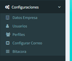 En este menú nos muestra todos los submenús que nos servirá para dictar las reglas de funcionamiento del sistema y cuenta con los siguientes submenús 1. Datos Empresa 2. Usuarios 3. Perfiles 4. Configurar Correo 5. Bitacora