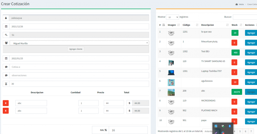 Para realizar una cotización de lado izquierdo vemos los datos principales como cliente fecha, fecha de vencimiento de la cotización y a lo ultimo son los días de entrega una vez confirmada la venta.