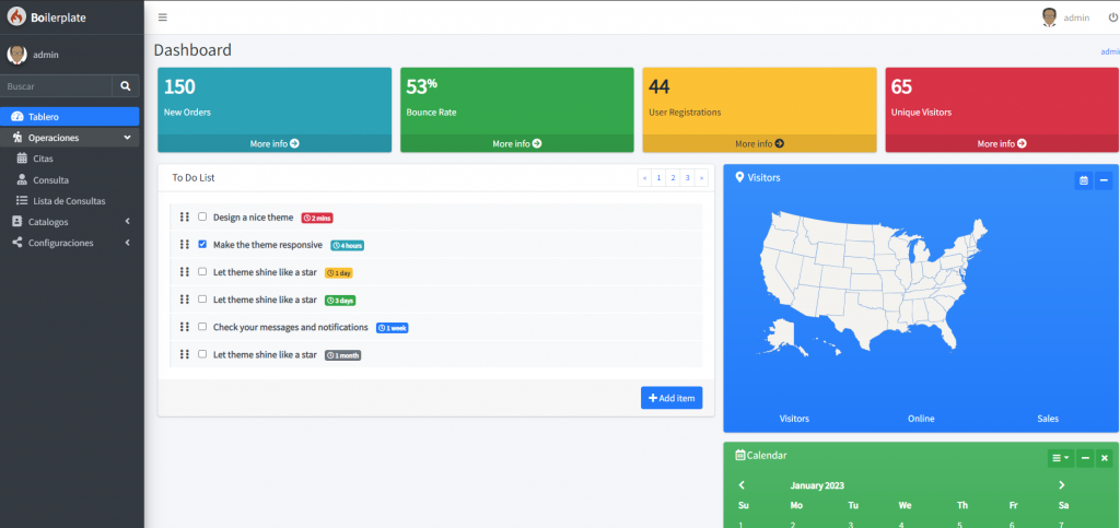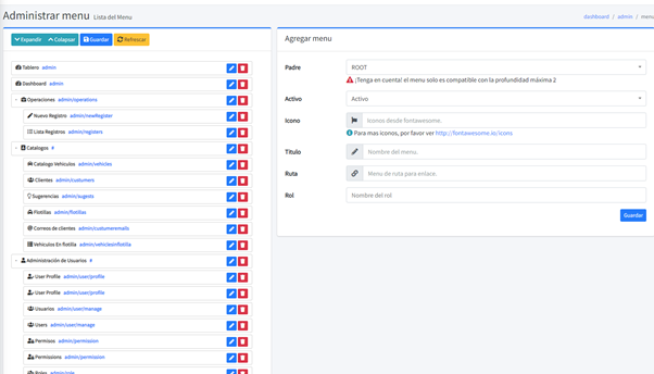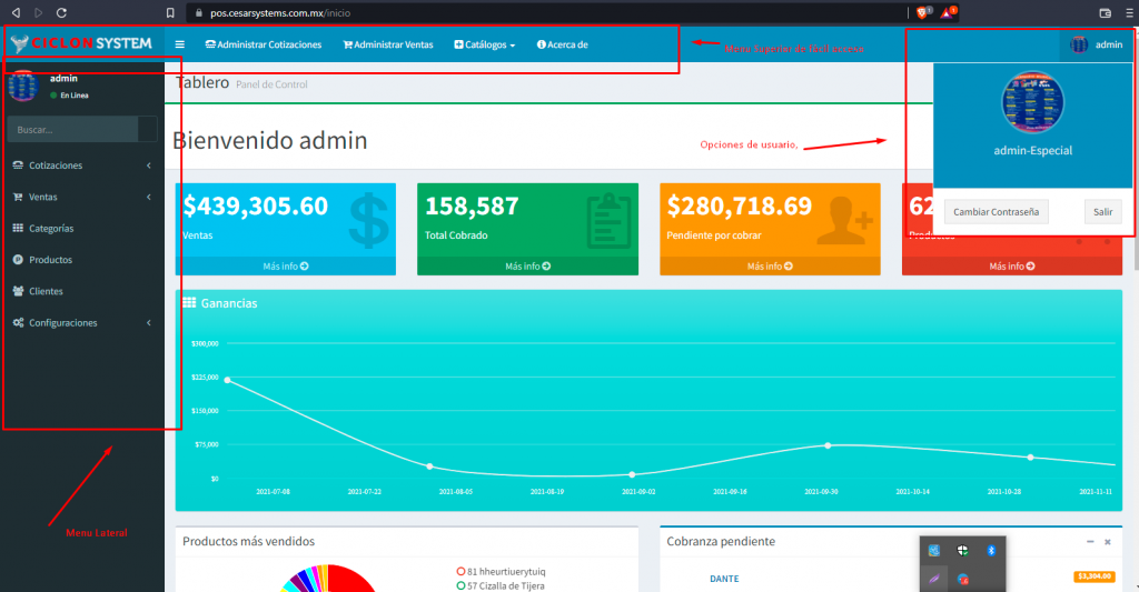 En esta imagen vemos el menú lateral expandido pero normalmente esta colapsado, este es el dashboard que ve el usuario con todos los derechos en el sistema