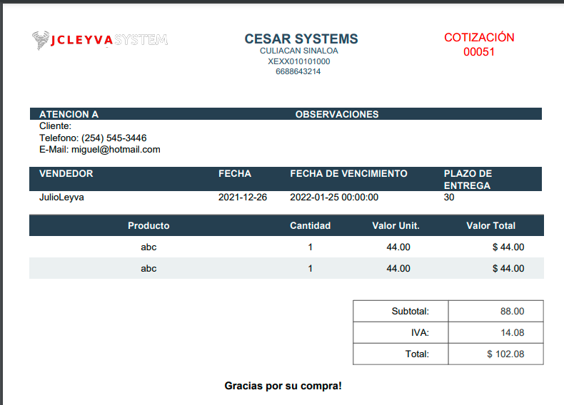 Si le damos guardar se genera el PDF de la cotización para poder imprimirla o enviársela por correo al cliente
