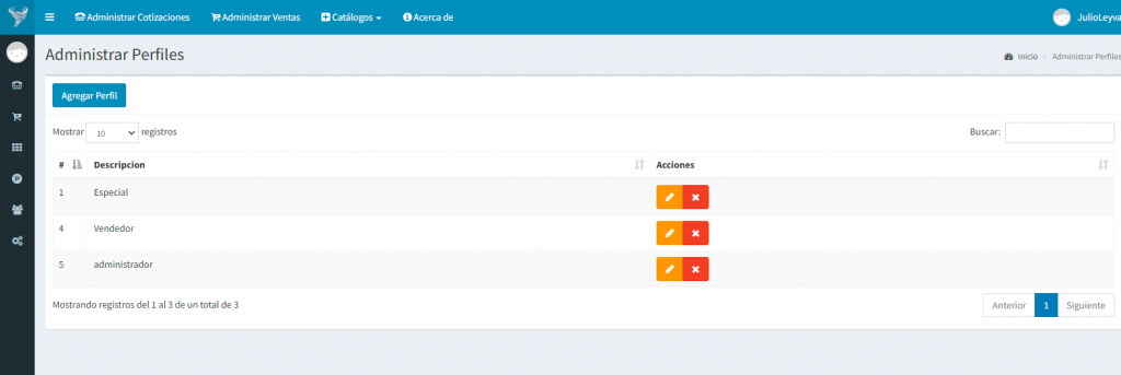 En este catalogo creamos los diferentes perfiles en los cuales le asignamos los derechos de acceso a las diferentes del sistema