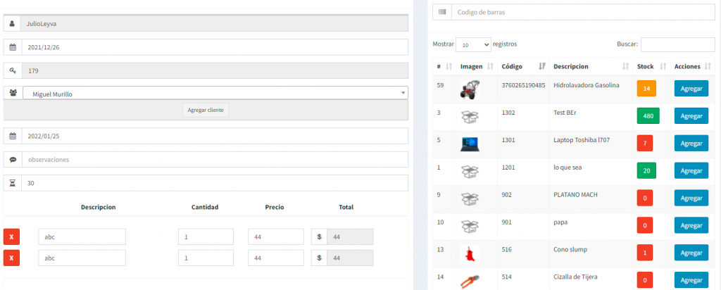 Aquí es donde capturamos los productos que se van a vender, también se le asigna la existencia ese valor va disminuyendo conforme se van haciendo ventas