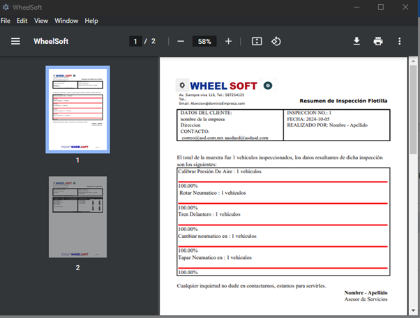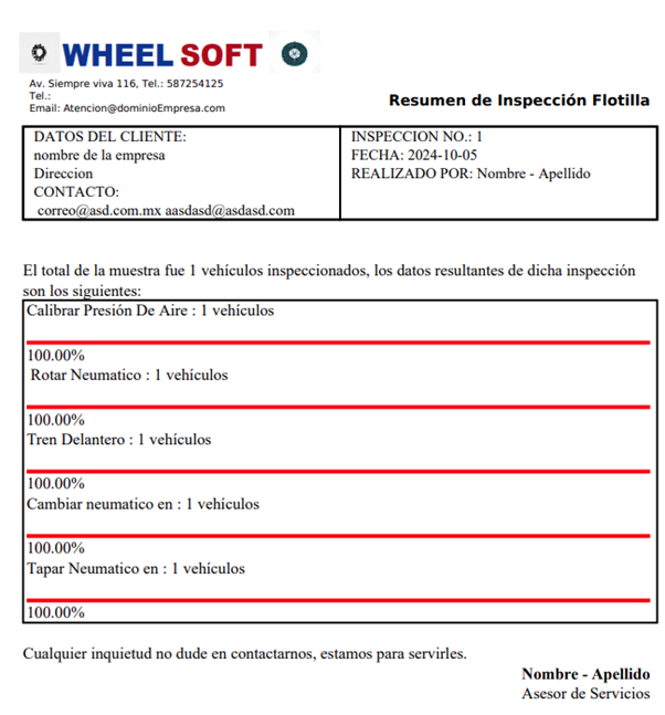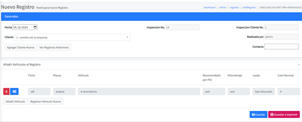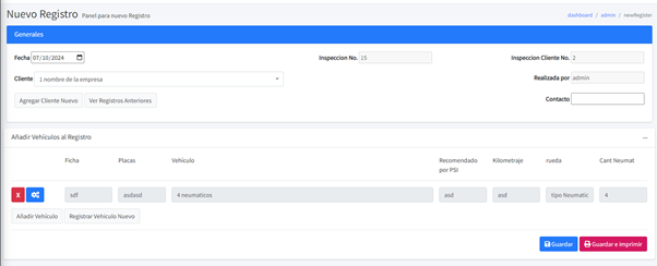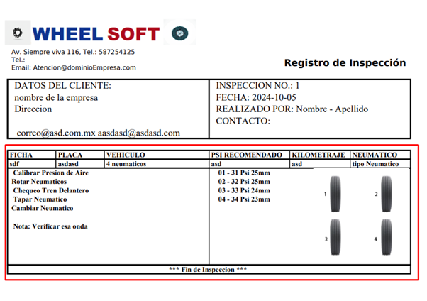 En la parte de abajo tenemos el detalle de la hoja de inspección que es donde ponemos el vehículo, automáticamente nos da los datos de fecha, placa, vehículo, PSI recomendado, Kilometraje, rueda y cantidad de neumáticos