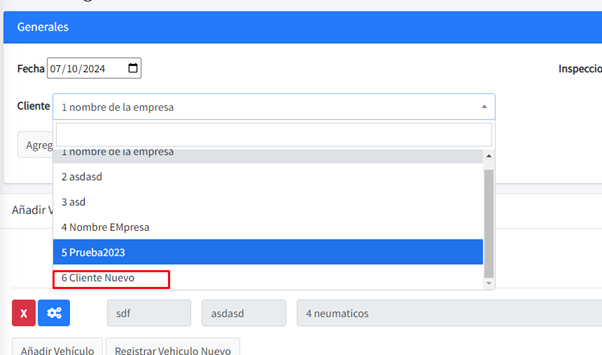 Al darle click en Añadir Vehículo nos mostrará la lista de todos los artículos del cliente