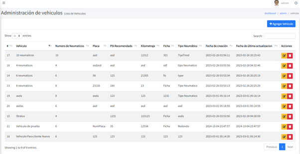 A continuación, vemos la lista de vehículos en la parte superior derecha tenemos el botón azul para registrar el vehículo y en la tabla en la columna acciones tenemos los botones de editar y eliminar vehículo