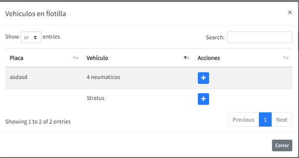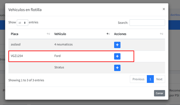 Al darle click al botón “+” ese vehículo se agregará a la lista