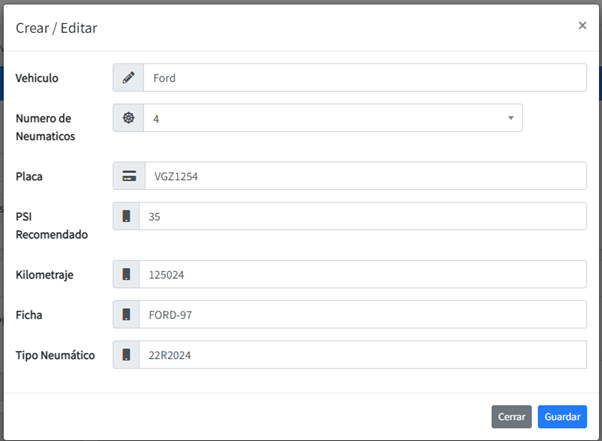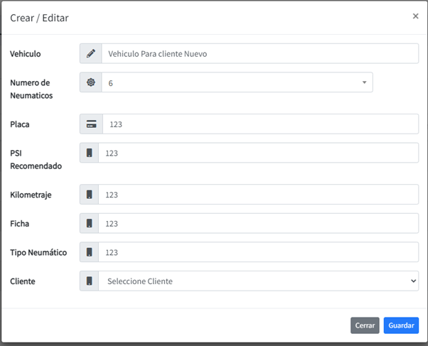 Al darle click a editar o agregar vehículo nos mostrará la siguiente pantalla modal