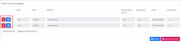 En el detalle tenemos los botones de eliminar y el de los engranajes, el de eliminar simplemente elimina el registro y el de los engranes nos captura los datos de inspección de ese vehículo.