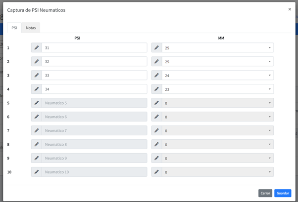 Al darle click nos sale el siguiente modal con dos pestañas, en la primera capturamos el PSI y los MM de cada neumático que tiene el vehículo, como este vehículo tiene 4 neumáticos es la razón por la cual solo cuatro campos están habilitados.