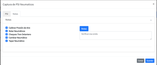 En la segunda pestaña NOTAS, nos sales diferentes checks, como el de calibrar Presión de aire, Rotar neumáticos, chequeo de tren Delantero, cambiar neumático, tapar neumático, y un área de texto para capturar una nota