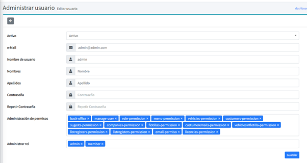 Al dar click al botón +Agregar usuario o en el botón editar que está en la columna acción nos mostrará el siguiente modal para capturar el usuario, en esa captura donde podemos dar los permisos necesarios al usuario y asignarle un rol