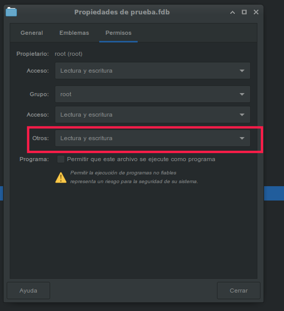Ahora solo falta darle derechos de acceso para poder leer la base de datos en DBEAVER , para ellos abriremos Thunar como administrador le damos propiedades al archivo prueba.fdb y en permisos le damos lectura a otros para que dbeaver nos permina leerlo
