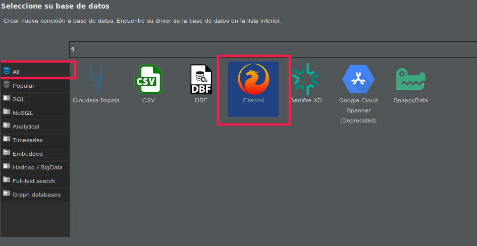 Primero abrimos DBEAVER y le damos en crear conexión, le ponemos en all “todos” y buscamos firebird
