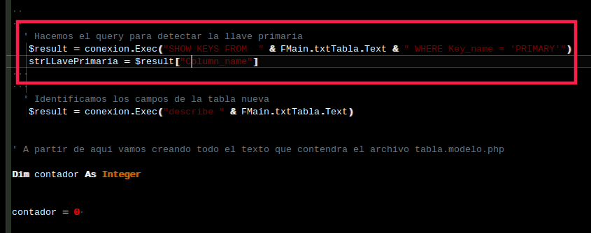 $result = conexion.Exec("SHOW KEYS FROM " & FMain.txtTabla.Text & " WHERE Key_name = 'PRIMARY'")