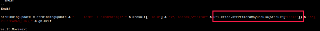 strBindingUpdate = strBindingUpdate & " $stmt -> bindParam(\":" & $result["Field"] & "\", $datos[\"editar" & utilerias.strPrimeraMayuscula($result["Field"]) & "\"], PDO::PARAM_STR);" & gb.CrLf