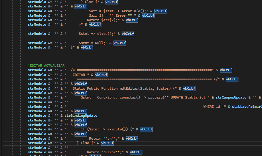 strModelo &= "" & " $stmt = Conexion:: conectar() -> prepare("" UPDATE $tabla Set " & strCamposUpdate & "" & vbCrLf