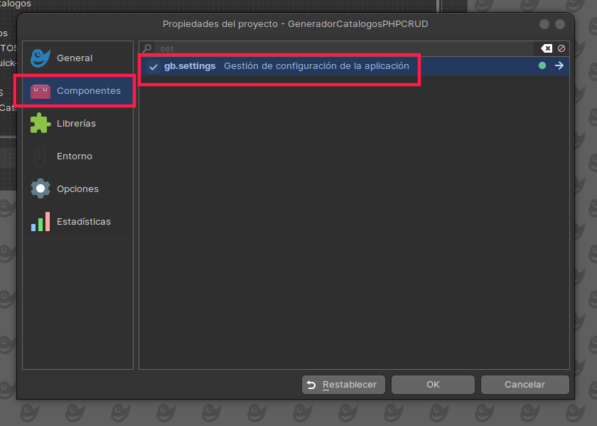 Para activar esta función nos vamos a propiedades del proyecto seleccionamos componentes y activamos el componente gb.settings