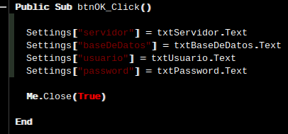 Ahora abrimos el archivo frmFormulario y le damos doble click al boton btnOK, no va a llevar al evento btnOK_Click entonces agregamos el siguiente codigo arriba de Me.Close(true)