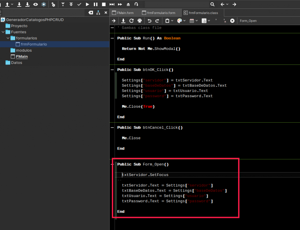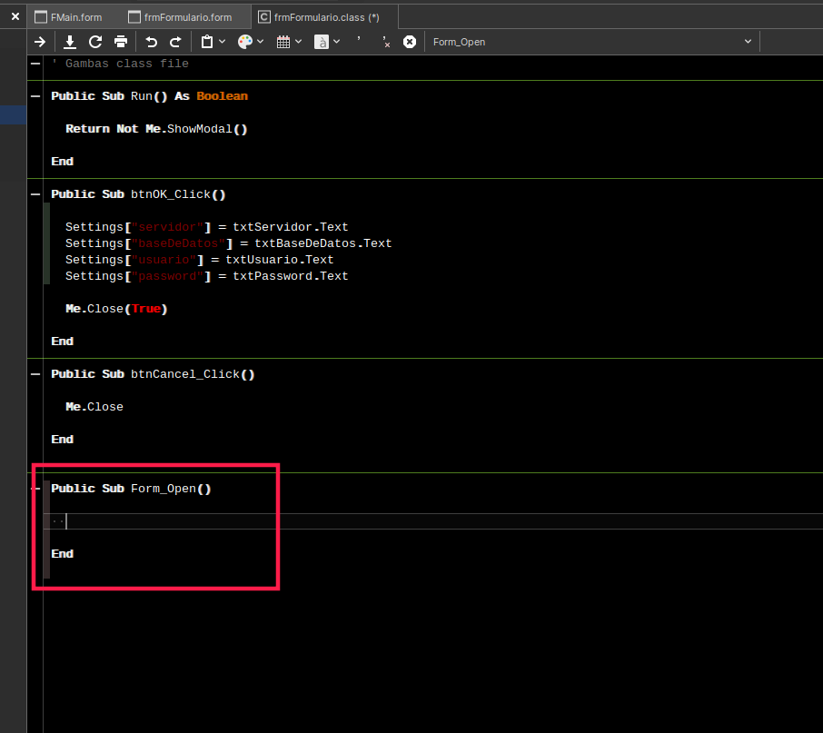 Entonces dentro de Form_Open() agregamos el siguiente código