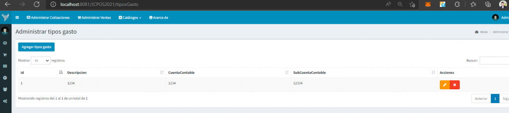 Primero creamos la tabla, en este ejemplo crearemos la tabla tiposGasto con la columna id como llave primeria, y las columnas descripcion, cuentaContable,subCuentaContrable les dejo el código SQL